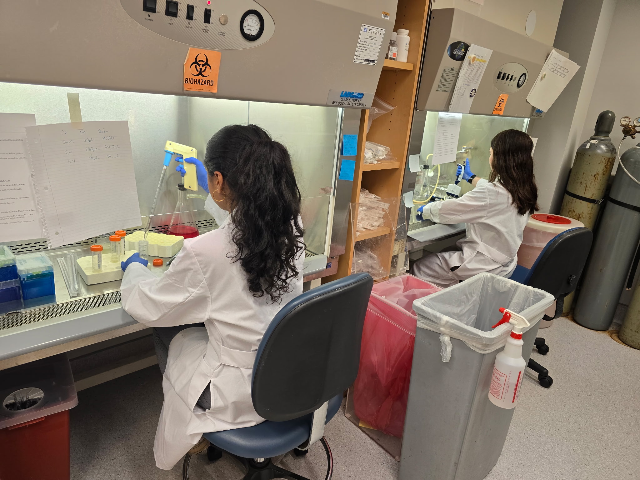 Neha (L) and Grace (R) already hard at work processing human islets for an experiment.