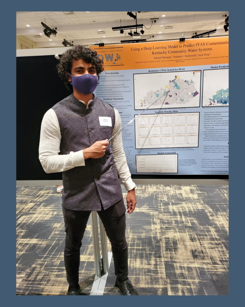 • Manapat, Aakash. Using a Deep Learning Model to Predict PFAS Contamination in Kentucky Community Water Systems (poster: presenter). Vanderbilt University Undergraduate Research Fair, Fall 2021.