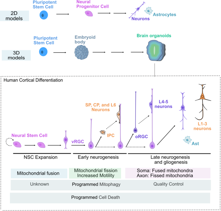 - Assessing the impact of the dynamic properties of the mitochondria and peroxisomes (fission, fusion, motility, and degradation) on early human cortical development using iPSC 2D and 3D model systems.