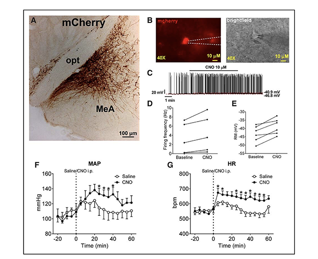 Figure: Effects of selective activation of medial amygdala (MeA) SIM1 neurons. A, mCherry immunoreactivity in the MeA of SIM-Cre mice following stereotactic infection with AAV-hM3Dq-mCherry. B, Electrophysiological recording from mCherry-labeled MeA SIM1 neurons in the brain slice from a SIM1-Cre mouse stereotactically infected with AAV-hM3Dq-mCherry. Fluorescence images of mCherry-labeled hM3Dq and brightfield images. Scale bars, 10 μm. C, Representative action potential traces in mCherry-labeled MeA SIM1 neurons in response to bath application of clozapine-N-oxide (CNO; 10 μmol/L). Firing frequency (D) and resting membrane potential (E) of each neuron at baseline and after CNO treatment. Temporal changes in mean arterial pressure (F) and heart rate (G) in AAV-hM3Dq-mCherry–infected SIM1-Cre mice receiving intraperitoneal injection of saline or CNO (3 mg/kg). Data are presented as mean ± standard error of the mean (SEM); n=7 per group. *P<0.05 in two-way analysis of variance followed by post hocSidak tests.