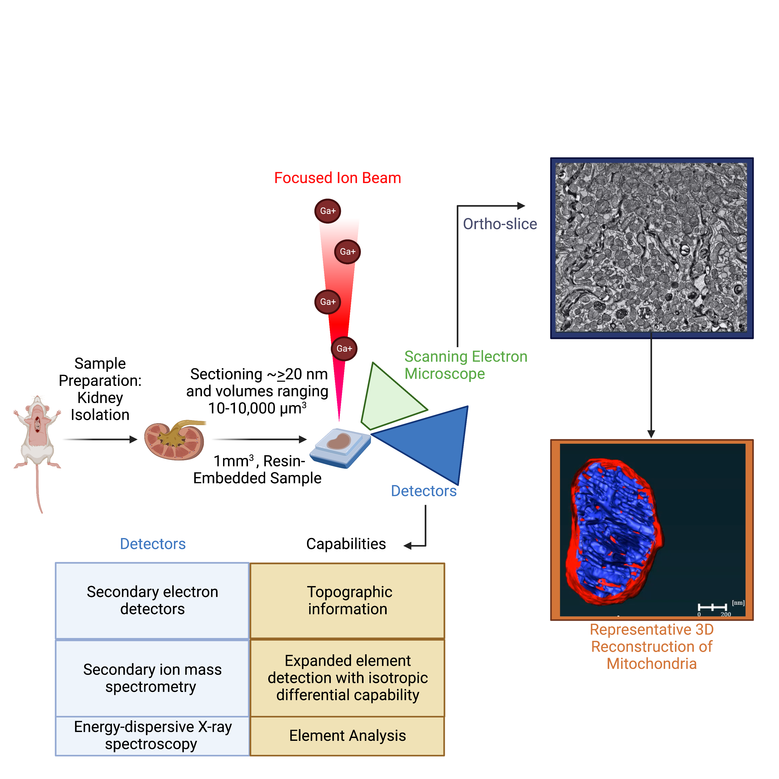 Figure: Schematic of focused ion beam scanning electron microscopy. Full explanation: Marshall, A. G., Damo, S. M., & Hinton, A., Jr (2023). Revisiting focused ion beam scanning electron microscopy. Trends in biochemical sciences, 48(6), 585–586. https://doi.org/10.1016/j.tibs.2023.02.005.