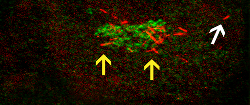 The goal of this project is to utilize a variety of high-resolution live-cell imaging techniques to examine the effect that RASSF1A has on MT network organization and dynamics as well as its influence on other organelles in the cell; in addition, we are examining how these functions of RASSF1A subsequently affect MT-based processes, such as cell migration and polarity. The picture shows two distinct localizations of the MT-binding protein RASSF1A: segmental RASSF1A localization to peripheral MTs (indicated by white arrow), and RASSF1A-bound Golgi-derived MTs (indicated by yellow arrows). The Golgi is shown in green, RFP-RASSF1A is shown in red.