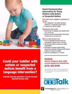 - Whose parents are willing to come to Vanderbilt for intervention and assessments, and are willing to have interventionists come to their home.