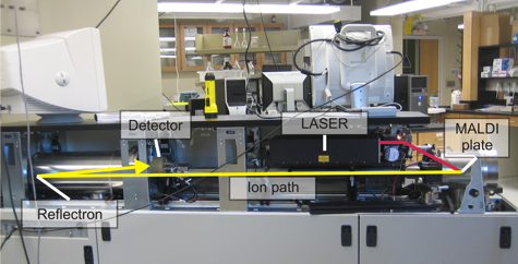 Matrix-Assisted Laser Desorption Ionization Time-of-Flight (MALDI-TOF) system, which is a proven technology for the MS analysis of both organic and inorganic compounds and biomolecule characterization.