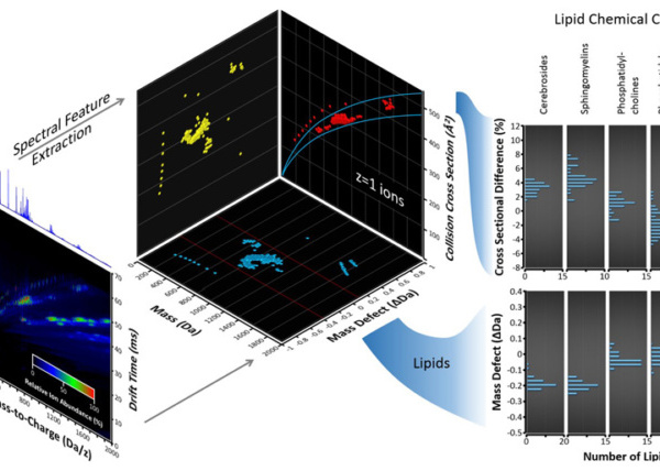 Figure 1. A multidimensional analysis of five lipid classes (two sphingolipids and three phospholipids) using data obtained from an IM-MS experiment1. (A) The raw IM-MS spectrum is projected as a heat map, with m/z on the x-axis, IM drift time on the y-axis, and signal intensity on the color mapping scale. (B) Feature extraction of singly-charged ions is performed, resulting in a “conformational space” plot of mass versus collision cross-section. (C) The accurate mass measurement (ca. 5 ppm in this work) can also be subjected to a mass defect scaling, resulting in a mass vs. mass defect plot. (D) Both the IM-MS conformational space map and the mass defect plot reveal groupings the data based on their respective lipid class, with sphingolipids separated from phospholipids.