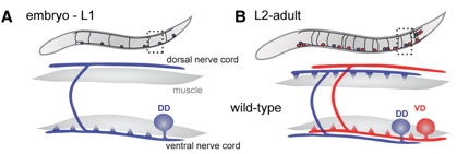 Figure 1. DD neurons remodel in the first larval (L1) stage. DD neurons switch synaptic output from ventral to dorsal muscles (blue triangles) whereas postembryonically derived VD neurons innervate ventral muscles (red triangles) and do not remodel.