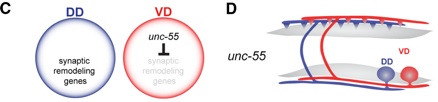 Figure 2. The COUP/TF transcription factor, UNC-55, is selectively expressed in VD neurons to block the synaptic remodeling program. (D) In unc-55 mutants, VD neurons switch ventral outputs to the dorsal side and thus adopt the synaptic polarity of DD neurons.