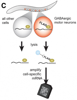 Figure 3. Strategy for identifying UNC-55 target genes. The mRNA tagging strategy was used to collect transcripts from GABAergic motor neurons. A comparison of wild-type vs unc-55 microarray profiles identified unc-55-regulated transcripts.