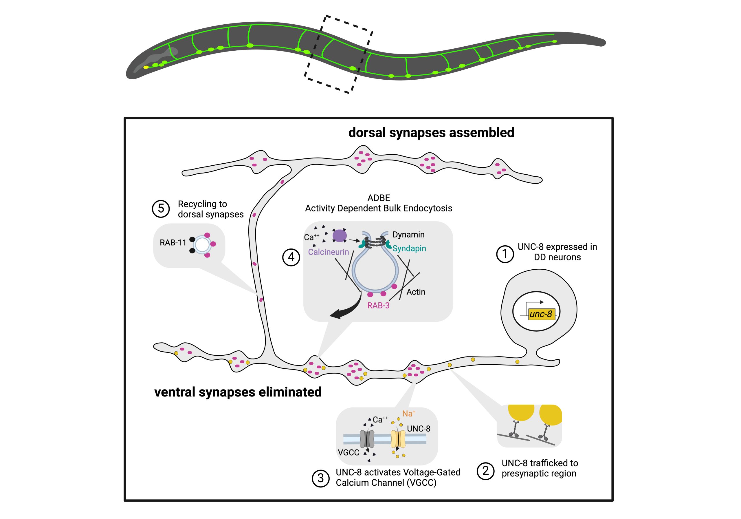 Figure 4 Proposed mechanism of UNC-8-dependent synapse disassembly and recycling in remodeling GABA neurons. UNC-8 promotes synaptic removal by elevating intracellular calcium and a downstream endocytic mechanism that recycles presynaptic components for assembly at new, dorsal DD synapses.