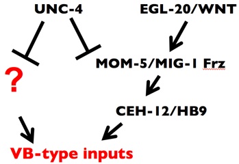 Although forced expression of CEH-12/HB9 is sufficient to induce miswiring of VA motor neurons throughout the C. elegans ventral nerve cord, ectopic CEH-12/HB9 is restricted to a subset of posterior VAs in unc-4 mutants (Von Stetina et al., 2007). We showed that CEH-12/HB9 expression in these posterior VA motor neurons depends on an EGL-20/Wnt signal from adjacent cells in the tail region. We propose that UNC-4 antagonizes a downstream canonical Wnt signaling pathway by negatively regulating the Frizzled receptors, MOM-5 and MIG-1 and thereby preventing VAs from responding to an available Wnt cue.