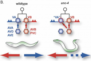 Backward locomotion is disrupted in unc-4 mutants in which VA motor neurons are miswired with inputs (gap junctions from AVB and chemical synapses from PVC) normally reserved for VB sisters.