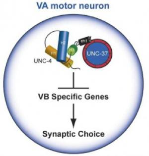 The mechanism whereby neurons select specific synaptic partners is a long-standing and still largely unsolved problem in neurobiology (Fig. 1). Our approach to this question is motivated by the discovery that the C. elegans unc-4 gene controls the specificity of synaptic inputs to a particular class of ventral cord motor neurons (Fig. 2) (White et al., 1992). Molecular analysis revealed that unc-4 encodes a homeodomain transcription factor that is selectively expressed in VA motor neurons to prevent the adoption of synaptic inputs normally reserved for their VB sisters (Miller et al., 1992;Miller et al., 1995).