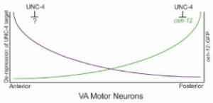 This finding suggests that loss-of-function mutations in unc-4 target genes that affect anterior VAs should also “suppress” the Unc-4 phenotype. An unbiased genetic screen for blr mutants (backward locomotion restored) has now revealed > 15 independent loci that suppress Unc-4. Preliminary genetic analysis has confirmed that at least three of these genes function in parallel to ceh-12 to regulate synaptic choice. We are now using whole genome sequencing to reveal the molecular identity of these blr genes.