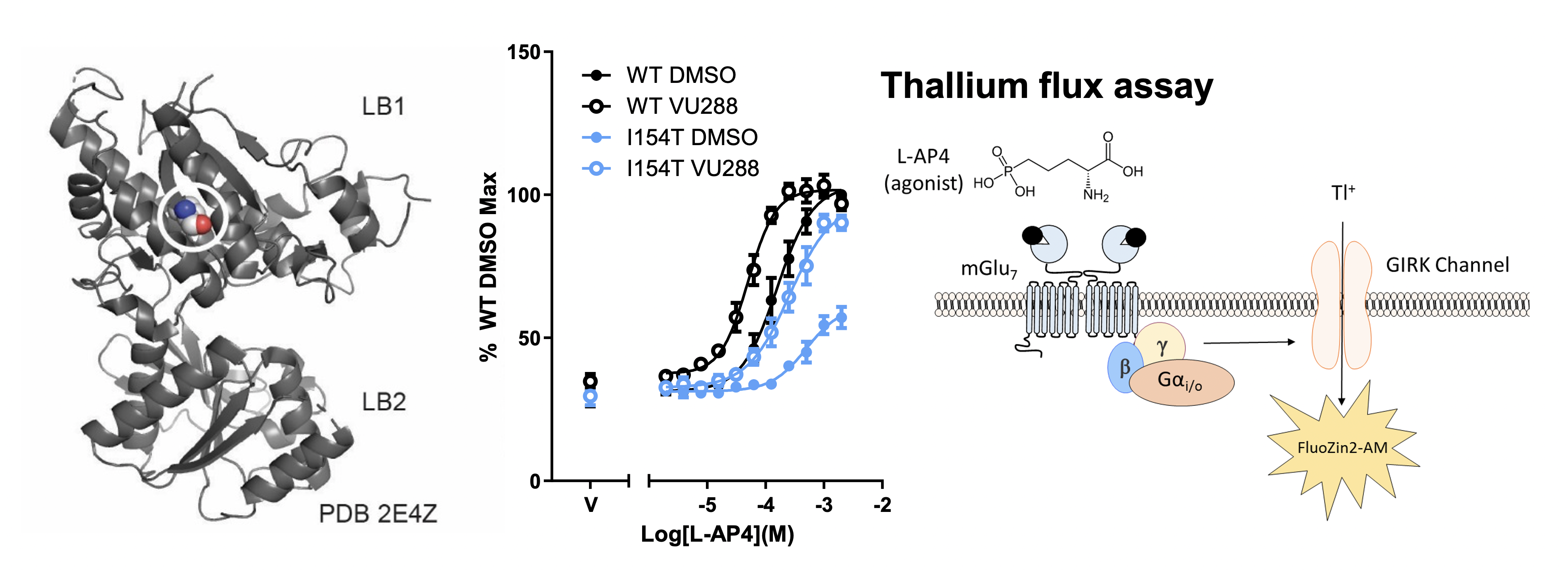Characterization of a mGlu7 mutation, I154T, associated with neurological disease in children. Location of the I154T mutation in the crystal structure of the mGlu7 ligand binding domain. This mutation has a decreased functional response in a thallium flux assay, which can be rescued with pre-application of the PAM, VU0422288.