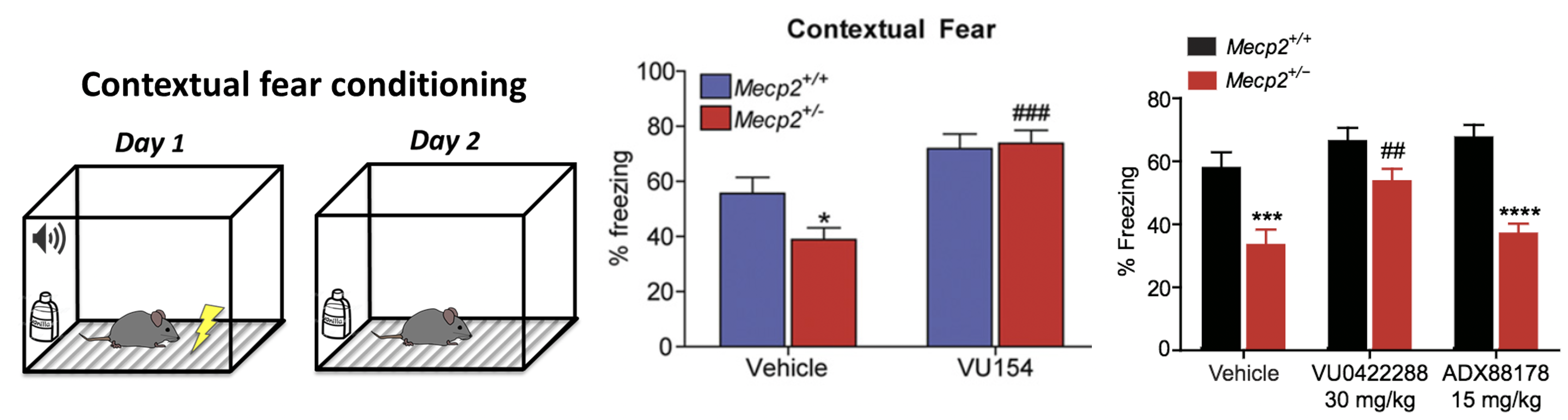 In both tasks, Mecp2+/- mice exhibit deficits, decreased percent freezing or no preference for the novel mouse. M4 PAM VU467154 and mGlu7 PAM VU0422288 both reverse these phenotypes.(Gogliotti et al 2018 J Pharmacol Exp Ther; Gogliotti et al 2017 Sci Transl Med)