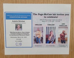 On March 5th, 2025, Aubrie defended her thesis titled “Mending the Matrix: Piezo Initiates Transient Collagen IV Production During Basement Membrane Repair”. Her committee consisted of Dr. Matthew Tyska, Dr. Gautam Bhave, Dr. Jared Nordman, and Dr. Barbara Fingleton. After her defense, the lab celebrated with family and friends with a “Grilled, Chilled, and Thrilled” party. Congratulations Dr. Stricker!!