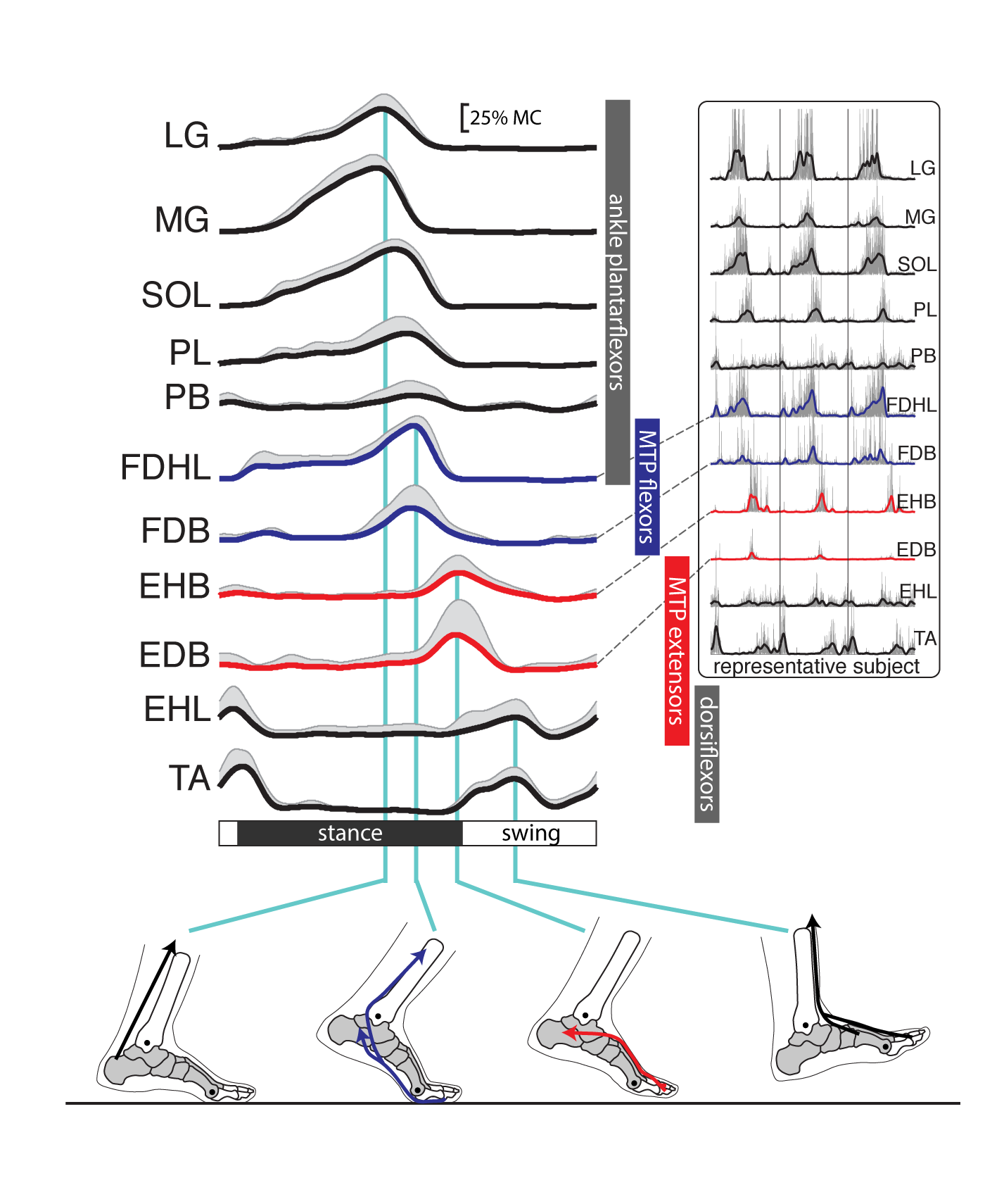 Conclusions. The sequential peak activity of MTP flexors followed by MTP extensors suggests that their biomechanical contributions may be largely separable from each other, and from other extrinsic foot muscles during walking. Meanwhile, the task-specific coordination of the foot muscles during other modes of locomotion indicates a high-level of specificity in their function and control.