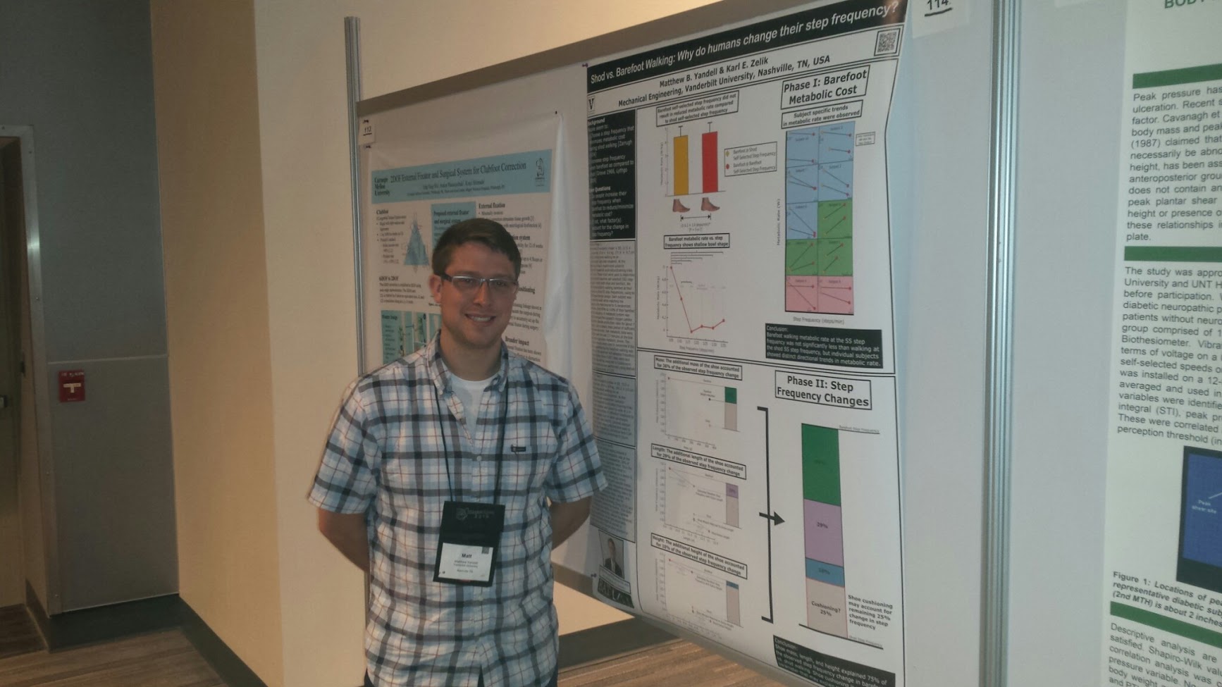 Matt Yandell presented findings on barefoot walking, examining how and why people change the way they walk barefoot vs. shod. Poster