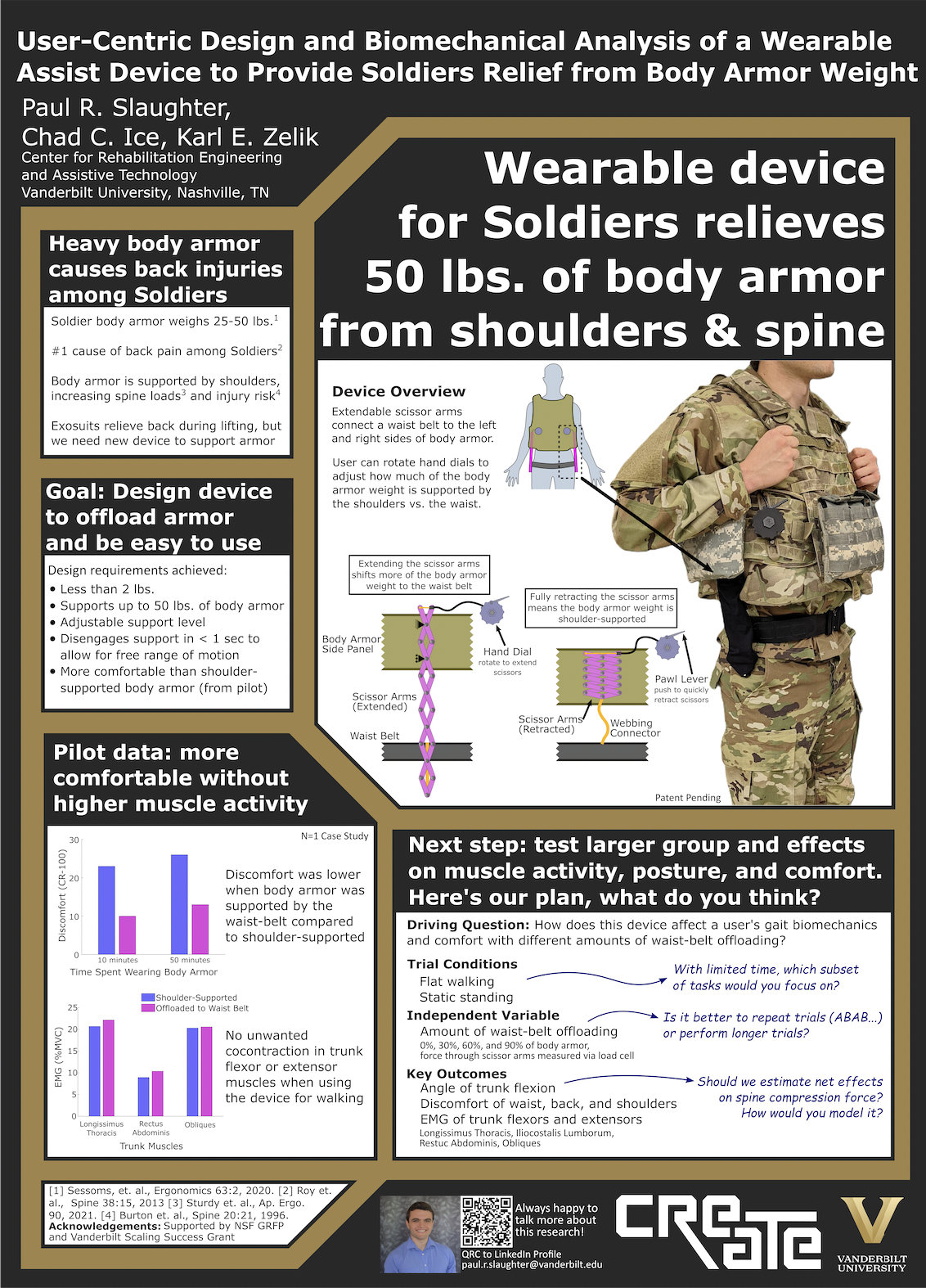 Slaughter, P. R., & Zelik, K. E. (2025). Wearable weight distribution devices for reducing injury risk: How varying amounts of body armor offloading affect biomechanics and comfort. Applied Ergonomics, 129, 104613.